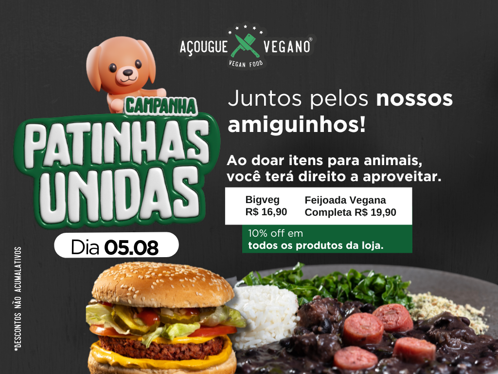 No último dia 5 de agosto, as lojas do Açougue Vegano em Moema, Rio de Janeiro (Flamengo, Barra e Ipanema) e Belo Horizonte foram palco de uma iniciativa inspiradora: a campanha Patinhas Unidas. Foi um dia marcado por solidariedade, engajamento e muito amor pelos nossos amigos de quatro patas. Nesse evento especial, conseguimos arrecadar uma quantia expressiva de doações que beneficiarão as entidades agraciadas.